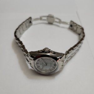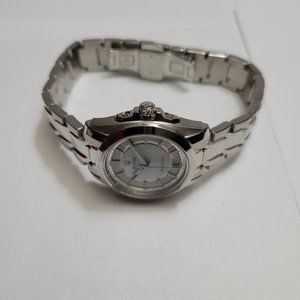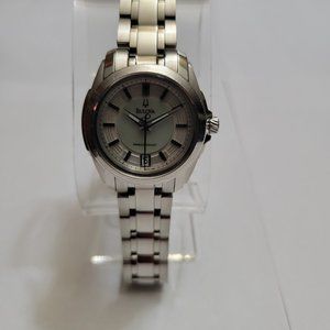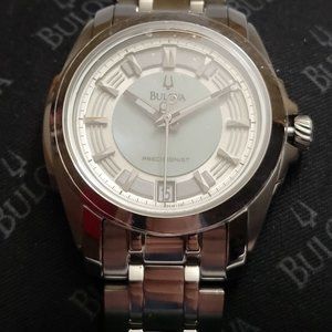Brand New Genuine Longwood Precisionist Bulova Watch. Stainless steel case with a stainless steel bracelet. Fixed stainless steel bezel. White mother of pearl dial with luminous hands and index hour markers. Minute markers around the outer rim. Dial Type: Analog. Date display at the 6 o'clock position. Quartz movement. Scratch resistant mineral crystal. Pull / push crown. Solid case back. Case diameter: 43 mm. Case thickness: 13 mm. Round case shape. Band width: 15 mm. Band length: 8. Push button deployment clasp. Water resistant at 30 meters / 100 feet. Functions: date, hour, minute, second. Luxury watch style. Bulova Precisionist White Mother of Pearl Dial Stainless Steel Ladies Watch 96M108.