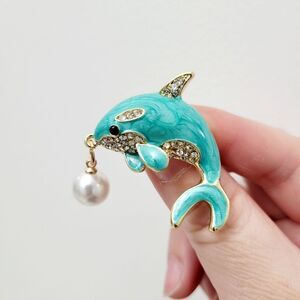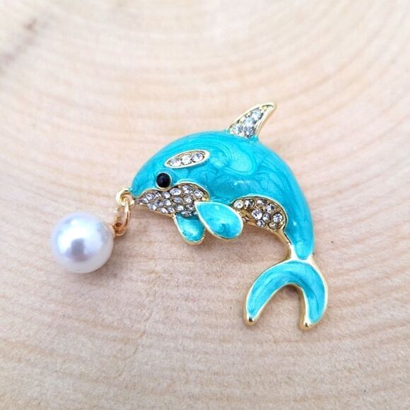 Brand New Gold Tone Blue Dolphin Pearl Rhinestone Brooch Pin