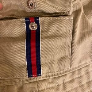 Stylish tan bucket hat with iconic Polo Ralph Lauren logo. Features a red and blue striped detail.