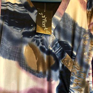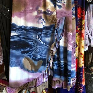 Brand new, large, ocean wave styled with a mix of purple, blue and white, Fiori, Summer Dress, 96% polyester and 4% spandex.