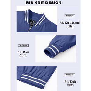 Design: Pinstripe rib knit collar, hem and cuffs, metal full zip closure, providing a soft-wearing comfort.