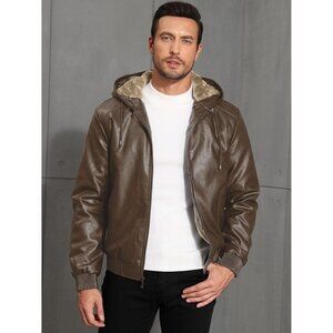 Brand New Men's Brown Polyester Sherpa Lined Hooded Faux Leather Bomber Jacket