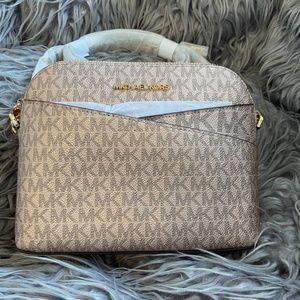 This brand new dome shaped crossbody bag with adjustable chain is a beauty! Convenient back slip pocket with gold tone hardware.