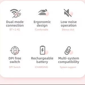 - 2.4G/Bluetooth connectivity, rechargeable battery, adjustable DPI (800-1600).