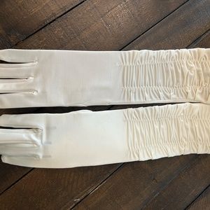Brand new still in packaging bridal wedding silk-like material gloves. Size S/M, Stretchy fabric. Hits just above the elbows.
