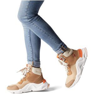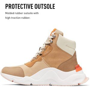 Condition is "New with box". URBAN HIKER Take on the city's rough terrain in weatherproof style. This sporty silhouette packs the all-day comfort of a sneaker with the waterproof protection of a boot, to help keep you defiantly dry against rain and slush. For added warmth, it’s microfleece lined and filled with 100g insulation. The footbed goes all in on plush EVA cushioning, while the high-traction sole sports SOREL’s iconic scallop design. Lace ‘em up and never look back. UPPER: A playful, layered hiker silhouette full of personality to take on the elements. Full grain leather, suede, and textile material mix with small reflective hits. Microfleece lining. Waterproof construction. Laces are not waterproof. INSULATION: 100g insulation. FOOTBED: Removable molded PU like EVA footbed with cozy, microfleece topcover. MIDSOLE: Molded EVA with expressive iconic SOREL scallop design. TPU heel clip. OUTSOLE: Molded rubber outsole with high traction rubber. HEEL HEIGHT: 1 in. PLATFORM HEIGHT: 1/2 in. SHAFT HEIGHT: 4 3/4 in. LACE LENGTH: 42 in. Please note: Laces and zippers incorporated in SOREL footwear are not waterproof. Measurements based on size 7.