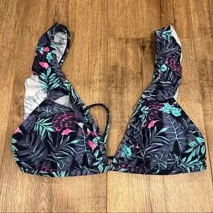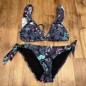 This is brand new, without the tags. It’s never been worn. A super cute set purchased from Ripzone. Originally paid over $80. The top has a tie along the back and the bottoms can be tied on each side.