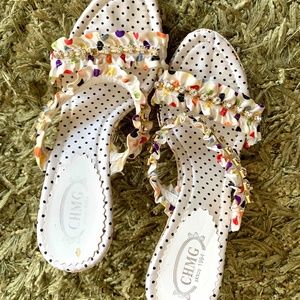 White beaded High Heels Sandals, open toes, strap filled with colourful silk ribbon and sparkling crystals bead.