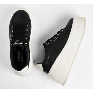 feature a sleek black upper paired with a chunky white rubber sole that adds height and attitude. The lace-up design ensures a