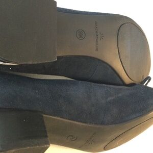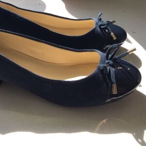 Lovely, elegant, brand new, still in box is this pair of flats/loafers. Navy blue suede, with black patin toes, with small string bow. These beautiful shoes would look great in the summer with capris and sweater for evening cocktail, or dressed up with a long dress or dress pants or evening out for dinner. They would evening look very cool with a pair of jeans. Size 9, width is medium.