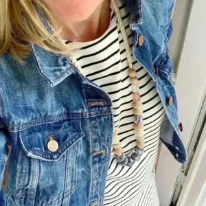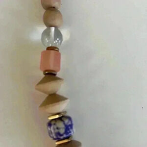 Stella & Dot Abriana necklace. It is 16” from top to bottom and made up of incredible mixed media pieces. There is wood, ceramics, macrame, acrylics along with a twisted cord and gold hardware. This piece retails for $89 and will be a great addition to any outfit!