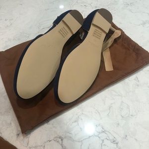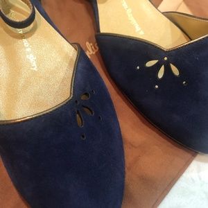 New, never been worn. These blue suede shoes with gold-trimmed peekaboo cutout are super cute and comfortable. Comes with shoe bag.