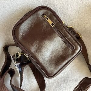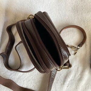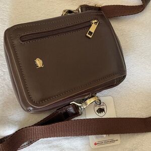 Brand new never worn. This bag can be worn by women as cross body bag. It is made of natural leather and has two components with many pockets inside for cell phone, keys, etc. it has zipper pockets on each side. See pictures for measurements. This was bought overseas, the brand is Buffalo Leather.
