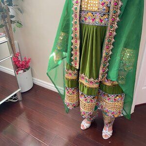 The traditional Afghan dress is crafted from high-quality velvet fabric in a rich olive-green color. It is meticulously hand-made with superior stitching and materials.