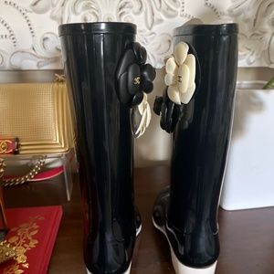 This is from my personal collection. NEVER WORN Chanel rain boots. Bought from Holt Renfrew. Comes with dust bags, original Chanel box with stickers showing the serial number and all details. Size 36. Can be worn during winter when weather is sloppy. Super classic and iconic with white and black camellia flowers and cute gold CC on each of the flower. You cannot find these anywhere ! Serious buyers only. I have many luxury high end designer items (clothings, handbags and shoes) wanted to sell. Inquire.
