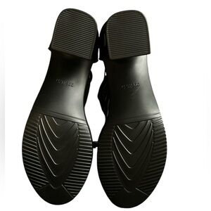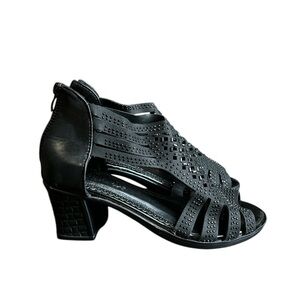 Elegant black sandals. Features rhinestones and a block heel. Back zipper closure.