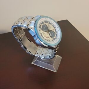 Experience timeless elegance with the Silver and Blue Chronograph Watch, featuring a sophisticated silver-tone stainless steel bracelet and a striking blue dial. The watch boasts a chronograph design with multiple subdials and luminous hands, offering both style and functionality. Its polished metallic bezel and date window add a touch of refinement, making it a perfect accessory for any occasion.