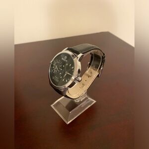 Stylish Skone watch with a black leather strap. Features a sleek black dial with silver accents.