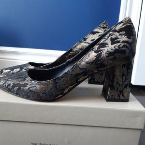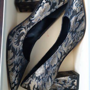 Brand new Marc Fisher heels. Beautiful heels are leather soles and beautiful gold fabric, black/gold in colour. In a box.