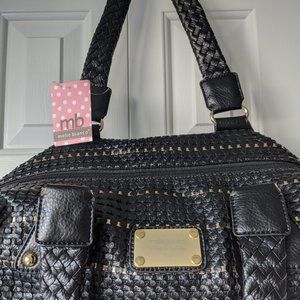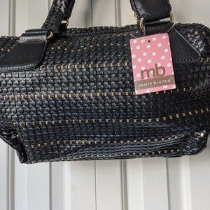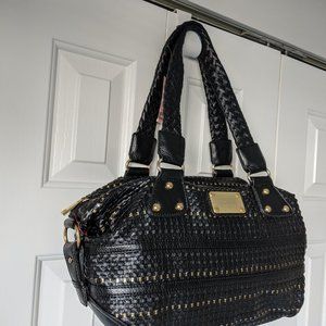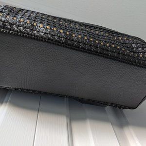 Faux leather. Black with gold. Purchased in a boutique store in Philadelphia for US $110 plus tax. Never used.