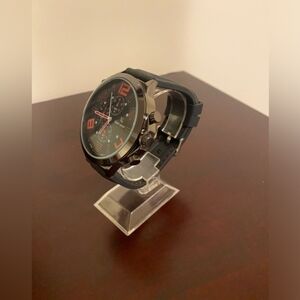 Stylish black and red chronograph watch with bold numerals. Perfect for any occasion.