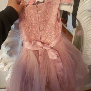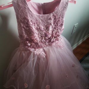 Pink with detailed applique flower lace on the bodice and single flowers wirh beaded center on the skirt. Zipper back. Puffy tool skirt with lots of layers. Tie back ribbon on backside for bow.
