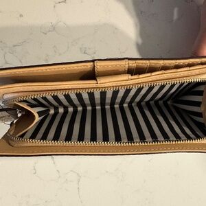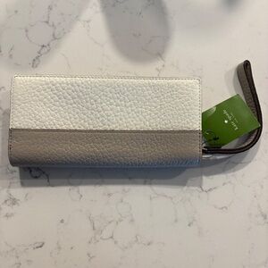 Brand new with tags Kate Spade wallet. White and grey pebbled leather on the outside. Inside is more of a beige colour. 19 card slots of cards. Zippered change pocket and two bigger pockets on the inside of the wallet. No issues as it’s brand new with tags.