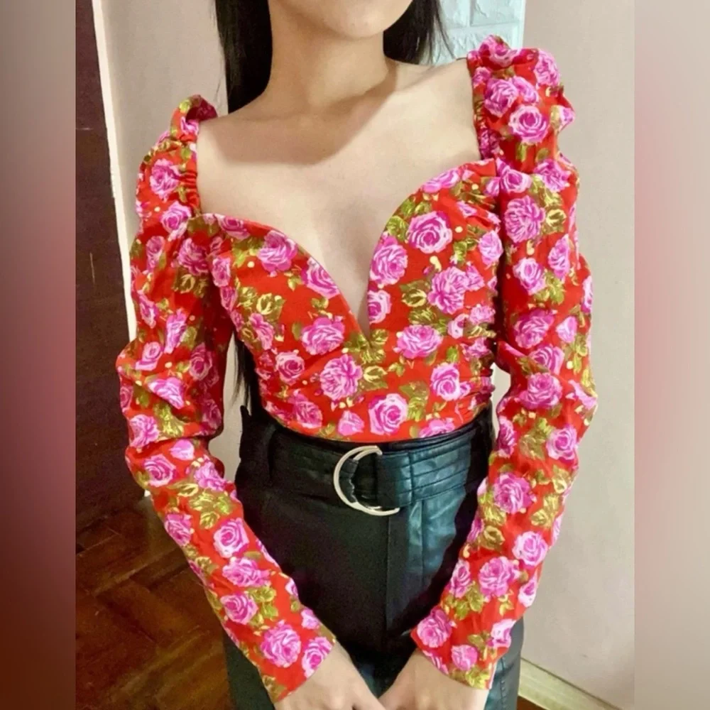 Cute new bra top called ROSES ROSES by Zara. Comes fully lined with hidden side zipper and puff shoulder sleeves. Pleated sides with re-enforced bustier top ! So no folds at the bust top over time! A well thought out design by Zara !!!