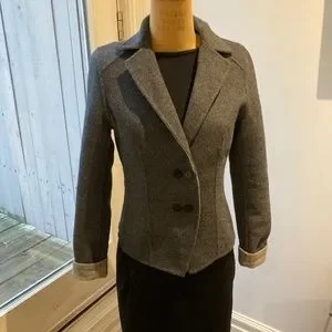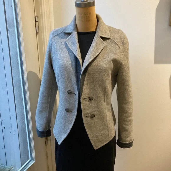 Reversible body hugging jacket. Light grey/dark grey. No label to be reversible. Lovely tailoring and in great condition. Feels like a cashmere blend. Looks awesome over little black dress or with t-shirt and jeans. Size S.