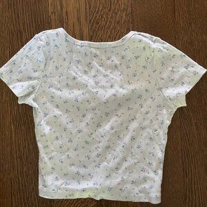 Brandy Melville top. Slightly cropped. White with blue flowers. Three buttons at the top.