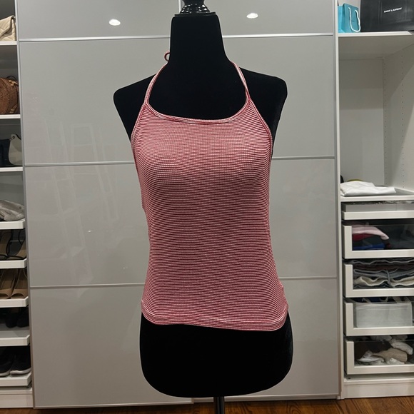 Red and white stripe halter top from Brandy Melville that ties at the neck and is open back. This style is no longer available in stores.