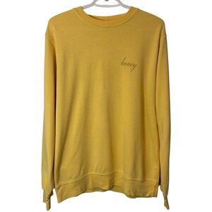 A yellow crewneck sweatshirt from Brandy Melville, also sold under the brand name John Galt, features the word "honey" embroidered in a script font on the chest. The sweatshirt has a relaxed or oversized fit and is typically sold as one size. It includes a classic crewneck collar, long sleeves, and ribbed cuffs and hem.