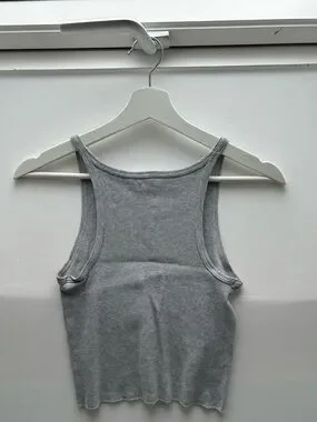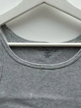 Brandy Melville ribbed tank in light grey. Slim sleeveless silhouette with a scoop neckline. Stretch knit fabric for a close fit. Cropped length with a raw hem.