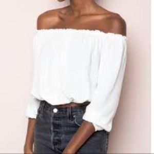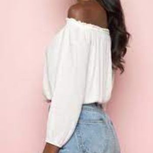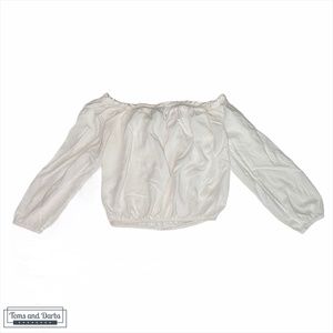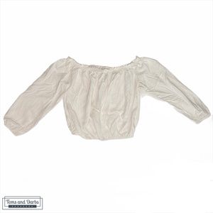 A classic spring piece, this light weight off the shoulder top has 1/2 sleeves, is cropped and a slight ruffle along top.