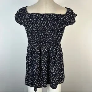 Chic navy blouse with delicate floral design. Smocked bodice and short sleeves.