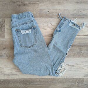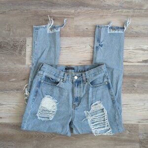 These are blue denim ultra distressed jeans by Brandy Melville. Made from rigid non-stretch denim with allover shredded holes and rips.
