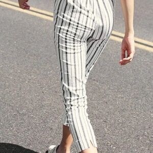 High-waisted pants with an elastic waistband. These pants are made in Italy from 100% cotton.