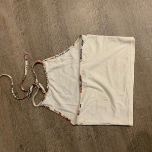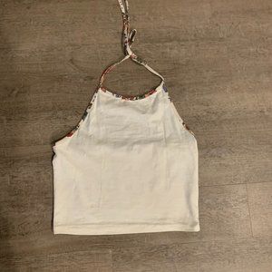 Cute little halter top with a floral string to tie. Great paid with jeans or dressed up for a night out!