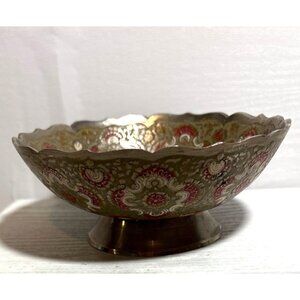 Brass Decorative Catch All Bowl Intricate Red Green Silver Floral Scalloped Edge
