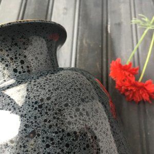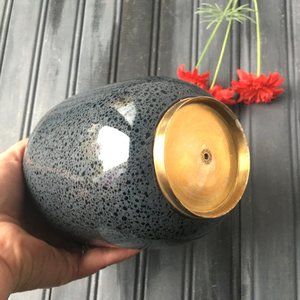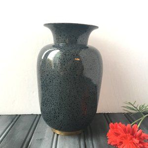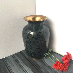 This listing is for a Stunning Brass Vase. The container is made out of brass with a grey enamel finish. This vase is stunning with the gold from the brass at the top and bottom and a lovely shiny gray enamel with black specks all over. Great for any room in the house.