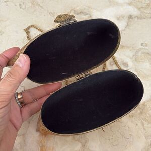 In excellent preowned condition lovely, unique pillow shaped evening bag made of solid brass, cloth lined, chain strap with 24” strap drop.