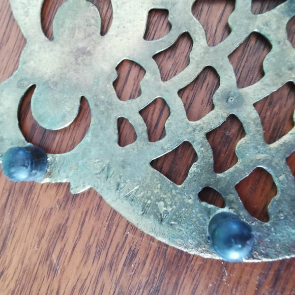 Set of 4 Cutout Brass Owl Trivets, 1 larger one at 5.25 inches in height and 4.25 inches in width, 3 smaller ones at 3.75 inches in height and 2.75 inches in width, made in Taiwan. Good Vintage condition, light wear marks and some patina, Please see pictures for further details