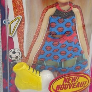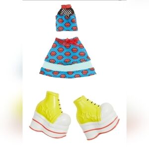 Bratz Fashion Pack "Kisses" outfit is inspired by the signature Bratz lip icon, featuring a lip-pattern halter and a pair of Bratz shoes.