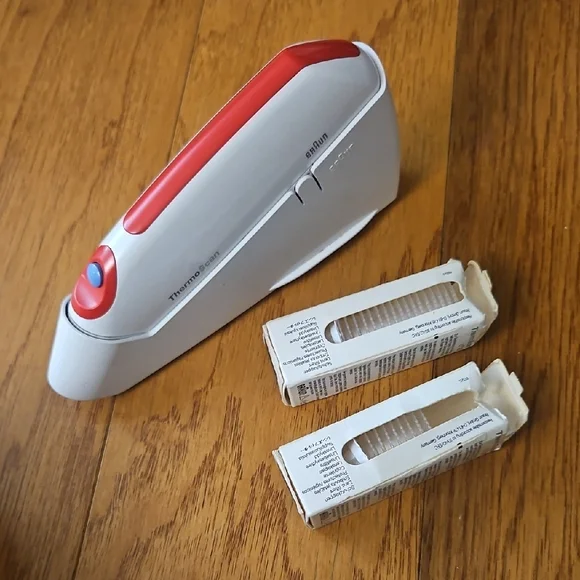Braun ThermoScan ear thermometer with red and white design. Includes two probe covers.