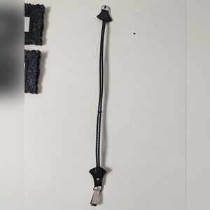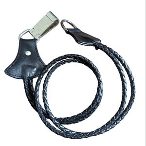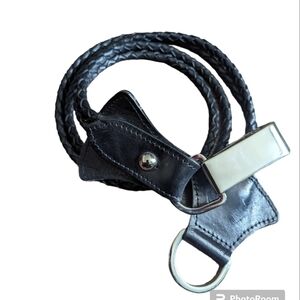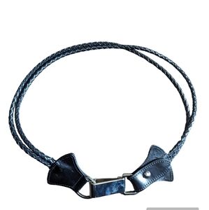 Dual woven rolled leather belt with silver hoop closure.