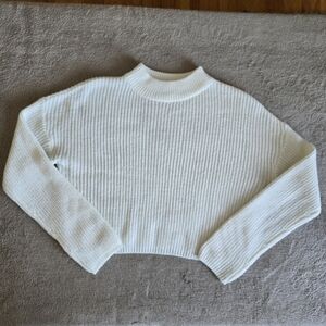 Lightweight knit sweater, mock-neck, cropped length, relaxed fit with dropped shoulders. In good used condition. Color is an off white