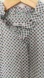 Stylish women’s ruffle-neck blouse featuring understated blue and tan pattern on white background. This blouse features hidden placket details.