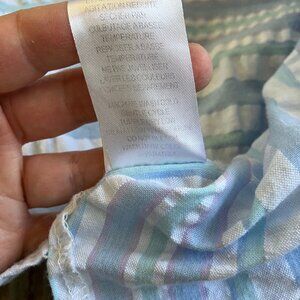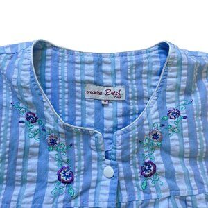 Breakfast in Bed brand short sleeve robe/dressing gown in blue/white seersucker fabric. Floral embroidery detail at neckline, snap front closures, two front pockets at hips. 55% cotton/45% polyester, machine washable. Women's plus size "1X" - see below for garment measurements. Good pre-owned condition, some fading to fabric from normal wash/wear.