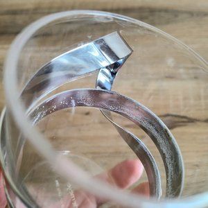 3 7/8'' tall, 2.5'' wide. Has some dirt between metal and glass. Not inside the mug. Overall is good condition.