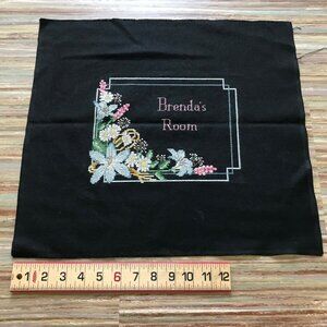 Completed cross stitch design for "Brenda's Room" with pretty floral motif along the border. Design size is approx. 7 1/4" x 9 1/4" (fabric size is 16x17 1/2"). Black fabric has a few dust spots from storage.